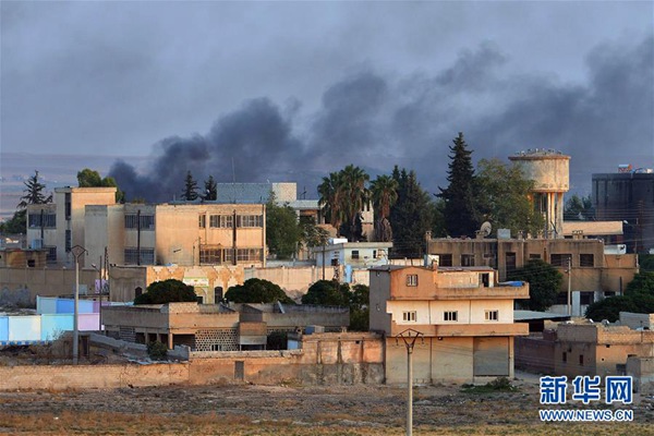 這是10月13日在土耳其阿克恰卡萊拍攝的受炮火攻擊的敘利亞北部邊境城鎮(zhèn)泰勒艾卜耶德。新華社發(fā)(穆斯塔法·卡亞 攝)