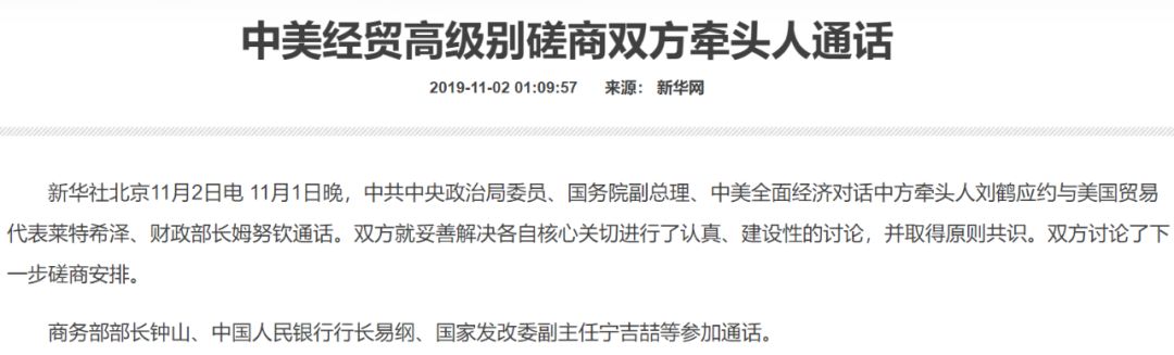 在充滿“變”的世界中,中美經(jīng)貿(mào)磋商進程也在發(fā)生著變化。11月1日晚,中美經(jīng)貿(mào)高級別磋商雙方牽頭人通了電話。