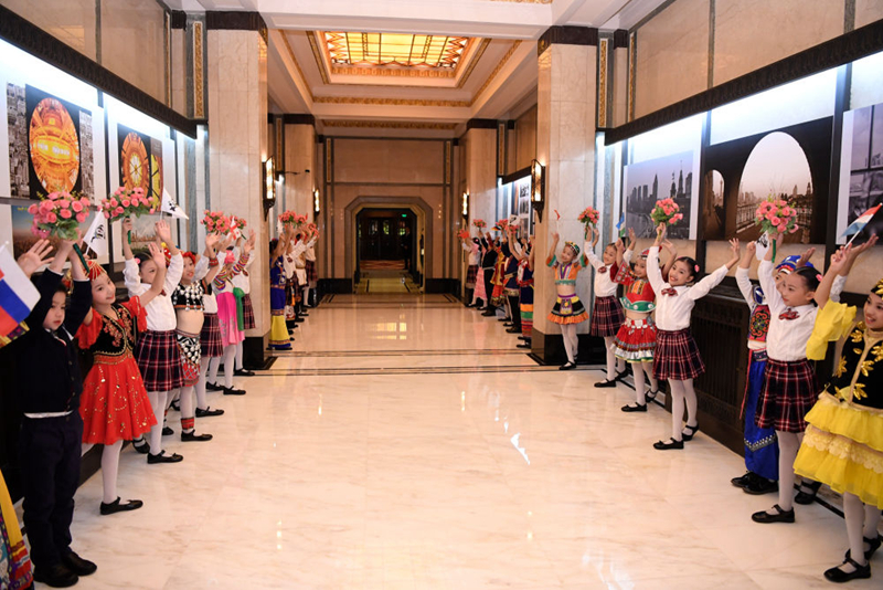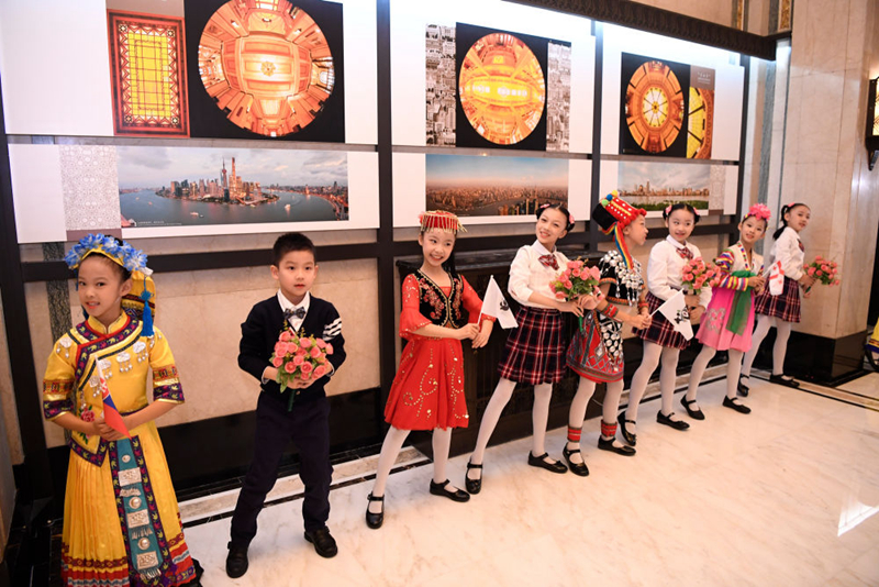 身著各民族服裝的少年兒童載歌載舞,迎接嘉賓到來(lái)——