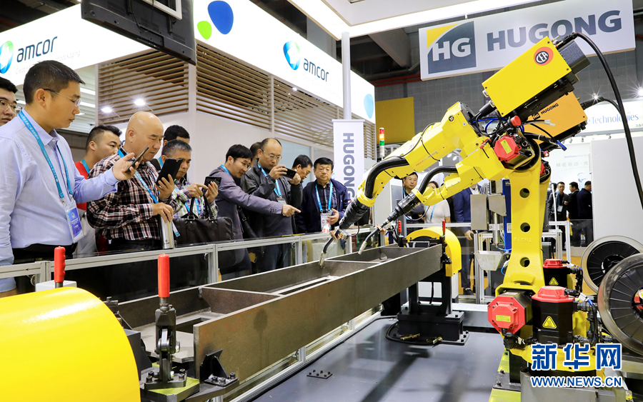 11月6日,在進(jìn)博會(huì)裝備展區(qū),一組正在進(jìn)行作業(yè)演示的焊接機(jī)器人吸引了參觀者的目光。當(dāng)日是第二屆中國(guó)國(guó)際進(jìn)口博覽會(huì)開(kāi)幕第二天,上海國(guó)家會(huì)展中心迎來(lái)首個(gè)“大客流”。新華社記者 方喆 攝