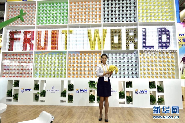 11月5日,第二屆進博會展區(qū)的工作人員展示香蕉等各色水果。 第二屆中國國際進口博覽會正在上海國家會展中心舉行,各展區(qū)色彩豐富的展品與設計讓人應接不暇。 新華社記者才揚 攝