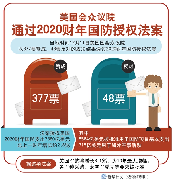 新華社華盛頓12月11日電(記者孫丁 徐劍梅)美國國會眾議院11日以377票贊成、48票反對的表決結(jié)果通過2020財年國防授權法案。