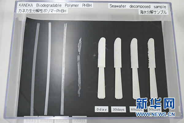 鐘化公司是日本一家知名化學(xué)品公司,記者日前前往鐘化公司的大阪總部,參觀了該公司研發(fā)的可降解聚合物“PHBH”。據(jù)介紹,這種可自然降解聚合物“PHBH”百分之百來源于植物,通過培養(yǎng)攝取植物油的微生物進(jìn)行生產(chǎn)提取,可用于制造各種塑料制品,“PHBH”在自然界中可被多種微生物分解。鐘化公司還實(shí)物展示了“PHBH”塑料制品在海水中自然降解的不同階段,例如一根吸管在海水中90天幾乎可被自然降解殆盡。