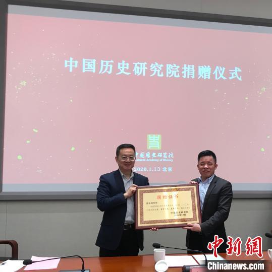 中國社科院副院長、黨組成員,中國歷史研究院院長、黨委書記高翔為陳玉樹頒發(fā)捐贈證書?!∪轿木辍z