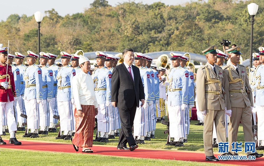 當?shù)貢r間1月17日下午,國家主席習近平在內(nèi)比都總統(tǒng)府出席緬甸總統(tǒng)溫敏舉行的隆重歡迎儀式。這是習近平在溫敏陪同下檢閱儀仗隊。 新華社記者 黃敬文 攝
