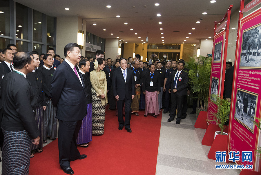 當?shù)貢r間1月17日晚,國家主席習近平在內(nèi)比都第二國際會議中心出席中緬建交70周年慶?;顒郁咧芯捨幕糜文陠觾x式。這是儀式開始前,習近平在緬方領導人陪同下,觀看慶祝中緬建交70周年圖片展。 新華社記者 黃敬文 攝