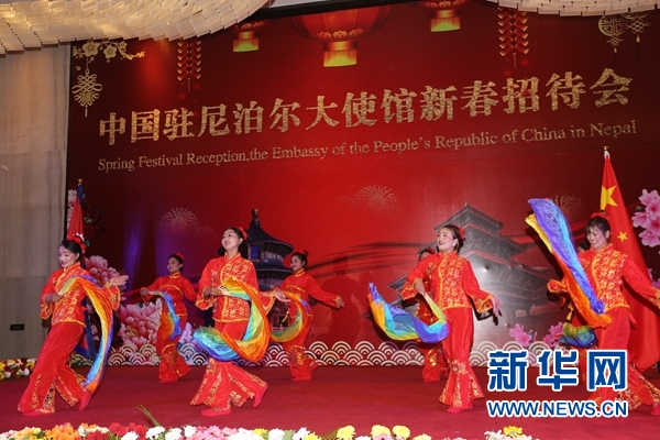 中國駐尼泊爾大使館2020年新春招待會開場舞蹈《歡天喜地》。記者 唐薇 攝