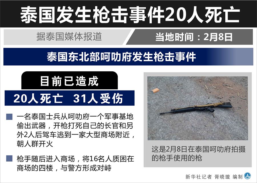 新華社曼谷2月8日電(記者汪瑾 任芊)據(jù)泰國媒體報道,泰國東北部呵叻府8日發(fā)生槍擊事件,目前已造成20人死亡、31人受傷。泰國特種部隊進(jìn)入槍手藏身的商場,商場內(nèi)大批民眾被疏散,但槍手目前所處位置尚不清楚。