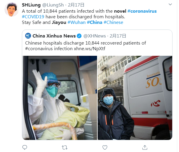 推特用戶SHLiung2月17日說:目前已經(jīng)有10844名新冠肺炎患者出院。希望你們平平安安,武漢加油。