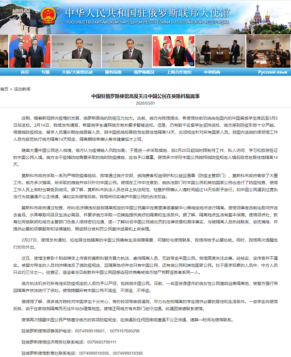 近期,隨著新冠肺炎疫情的發(fā)展,俄羅斯面臨的防疫壓力加大。此前,俄方向我館提出,希使館協(xié)助勸說尚在國內(nèi)的中國留俄學(xué)生推遲至3月2日后返校。2月14日,我館發(fā)布通報,希留俄學(xué)生遵照俄方有關(guān)要求暫緩返校。但是,仍有數(shù)千名留學(xué)生堅持返校,俄方感到防疫形勢十分嚴(yán)峻。根據(jù)俄防疫規(guī)定,留學(xué)人員屬長期在俄居留人員,自中國抵俄后需自覺在居住地隔離14天,此項(xiàng)規(guī)定針對所有國家人員。自國內(nèi)返俄的使領(lǐng)館工作人員均自覺執(zhí)行俄方隔離14天規(guī)定,隔離期結(jié)束確認(rèn)身體健康后才上班。