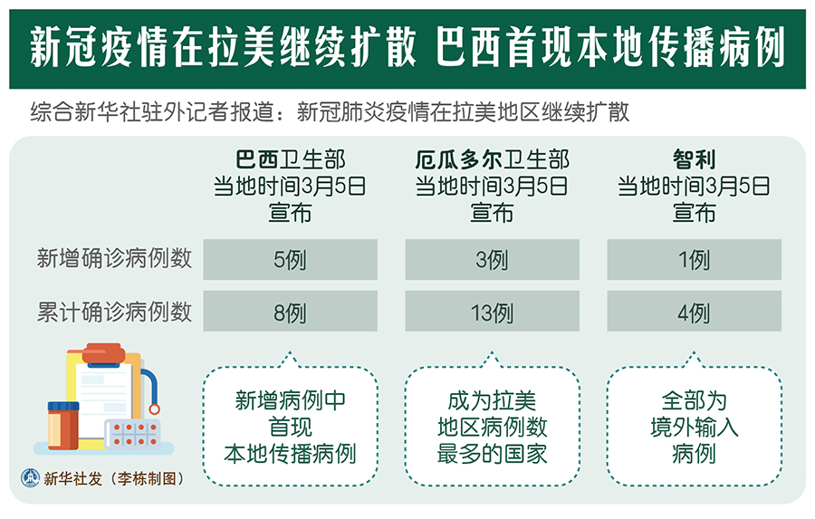新華社墨西哥城3月5日電? 綜合新華社駐外記者報(bào)道:新冠肺炎疫情在拉美地區(qū)繼續(xù)擴(kuò)散。巴西政府5日宣布該國首現(xiàn)本地傳播病例,厄瓜多爾、智利和阿根廷確診病例數(shù)量也在增加。拉美多國紛紛提升防控力度,加強(qiáng)應(yīng)對措施。