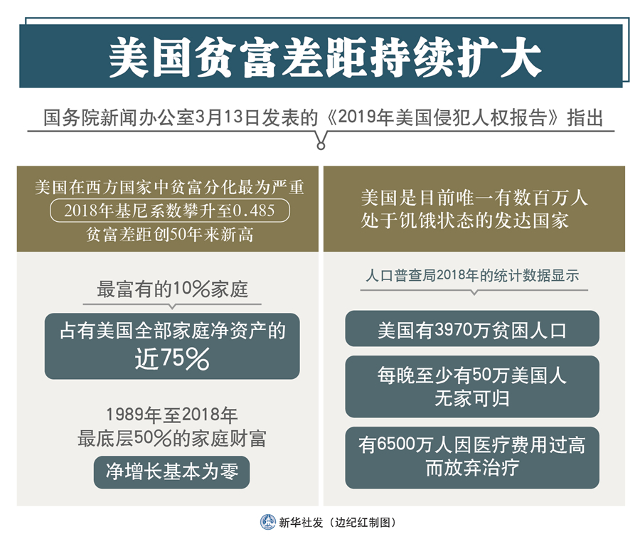 新華社北京3月13日電(記者王子銘、李超)國務(wù)院新聞辦13日發(fā)表的《2019年美國侵犯人權(quán)報(bào)告》指出,美國國民收入分配差距持續(xù)擴(kuò)大,底層民眾生活苦不堪言。