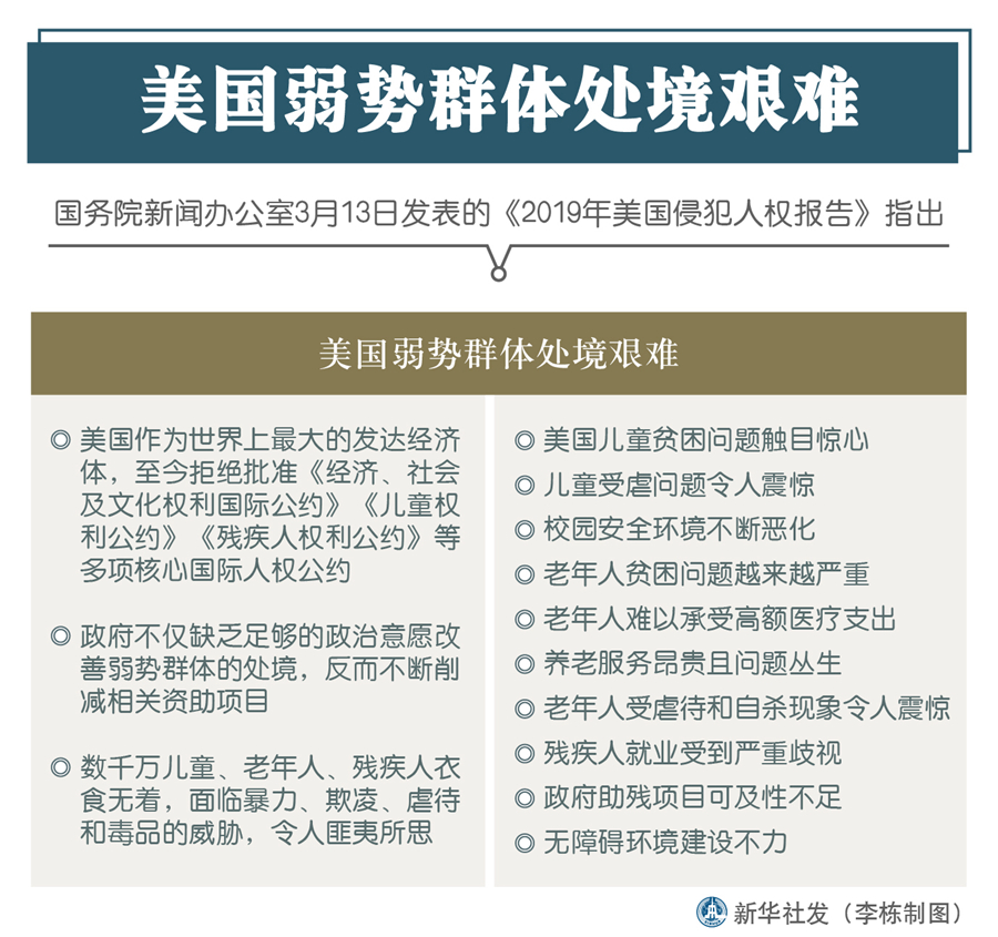 新華社北京3月13日電(記者王鵬、賈釗)國務(wù)院新聞辦13日發(fā)表的《2019年美國侵犯人權(quán)報(bào)告》指出,美國弱勢(shì)群體處境艱難。