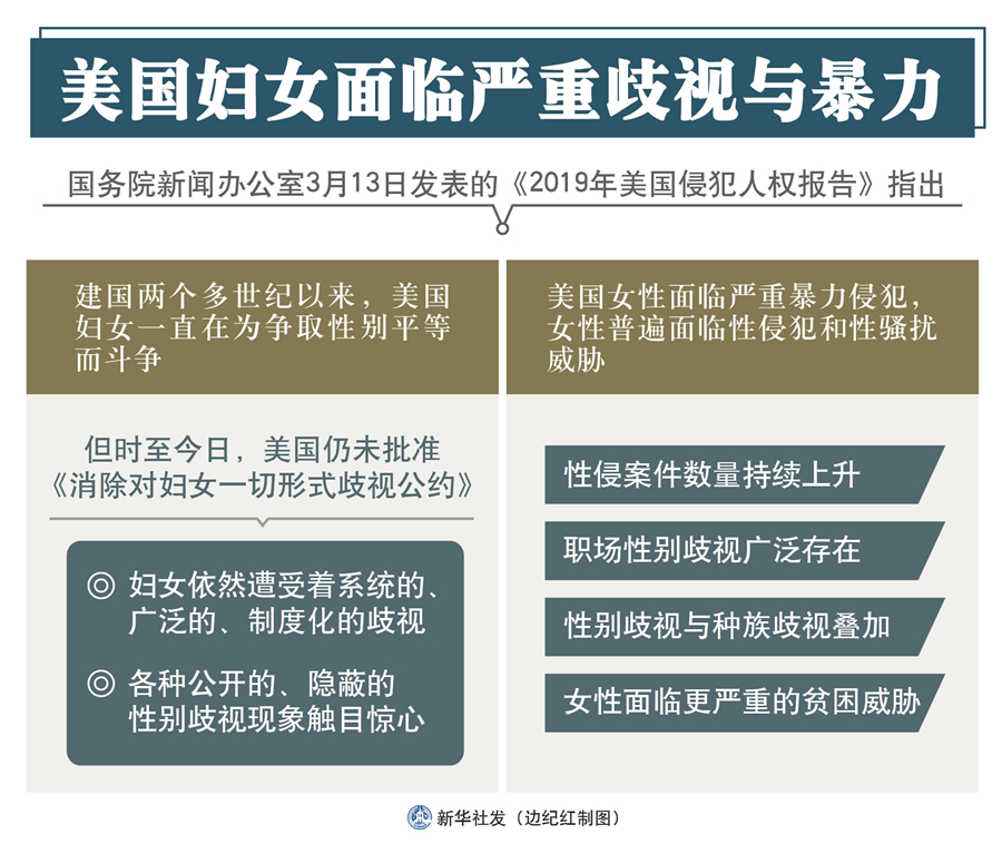 新華社北京3月13日電(記者王鵬、張?jiān)讫垼﹪鴦?wù)院新聞辦13日發(fā)表的《2019年美國侵犯人權(quán)報(bào)告》指出,美國婦女面臨嚴(yán)重歧視與暴力。