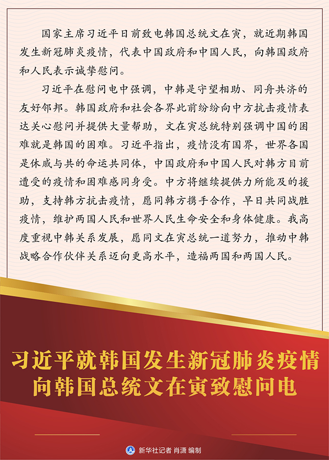 習近平在慰問電中強調,中韓是守望相助、同舟共濟的友好鄰邦。韓國政府和社會各界此前紛紛向中方抗擊疫情表達關心慰問并提供大量幫助,文在寅總統(tǒng)特別強調中國的困難就是韓國的困難。習近平指出,疫情沒有國界,世界各國是休戚與共的命運共同體,中國政府和中國人民對韓方目前遭受的疫情和困難感同身受。中方將繼續(xù)提供力所能及的援助,支持韓方抗擊疫情,愿同韓方攜手合作,早日共同戰(zhàn)勝疫情,維護兩國人民和世界人民生命安全和身體健康。我高度重視中韓關系發(fā)展,愿同文在寅總統(tǒng)一道努力,推動中韓戰(zhàn)略合作伙伴關系邁向更高水平,造福兩國和兩國人民。