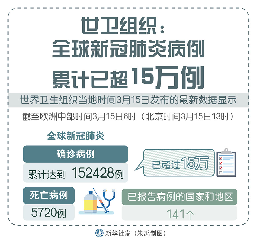 數(shù)據(jù)顯示,截至歐洲中部時(shí)間15日6時(shí)(北京時(shí)間15日13時(shí)),全球新冠肺炎確診病例累計(jì)達(dá)到152428例,死亡病例5720例,已報(bào)告病例的國(guó)家和地區(qū)達(dá)141個(gè)。