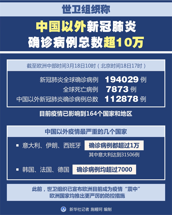 新華社日內(nèi)瓦3月18日電(記者劉曲)世界衛(wèi)生組織18日的最新數(shù)據(jù)顯示,中國以外新冠肺炎確診病例總數(shù)已超10萬,達到112878例。