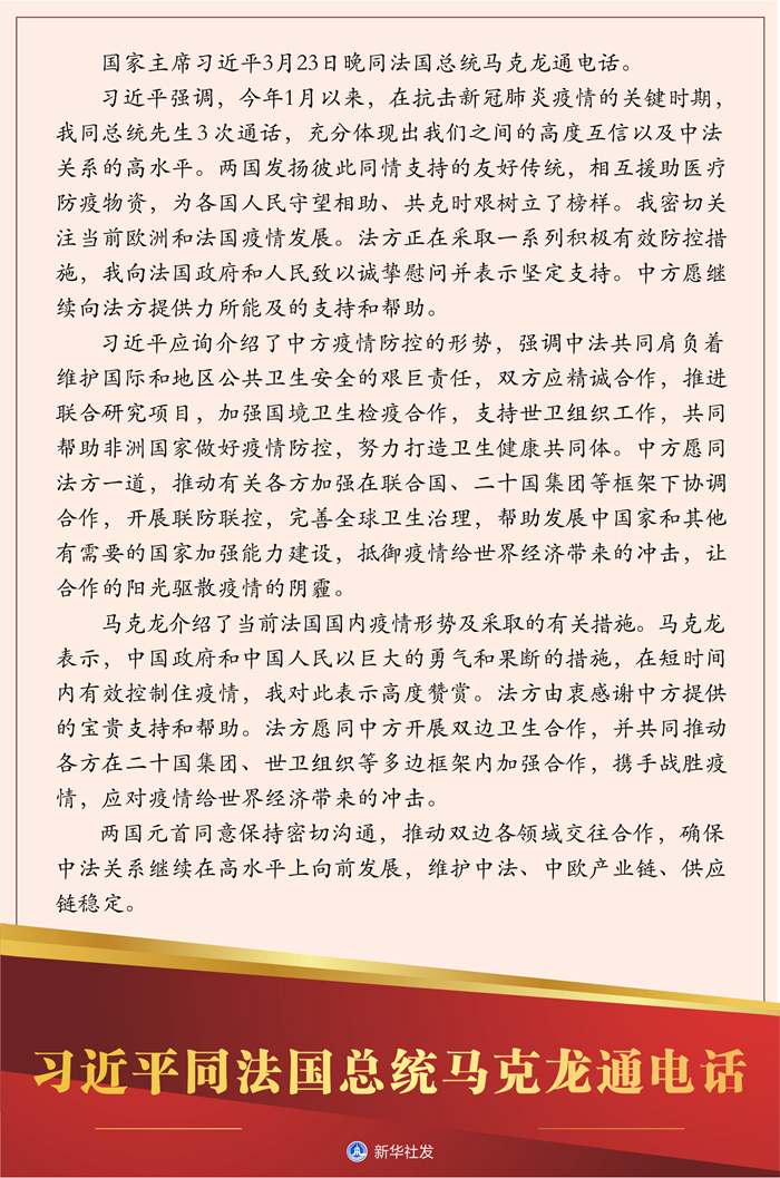 習近平應詢介紹了中方疫情防控的形勢,強調(diào)中法共同肩負著維護國際和地區(qū)公共衛(wèi)生安全的艱巨責任,雙方應精誠合作,推進聯(lián)合研究項目,加強國境衛(wèi)生檢疫合作,支持世衛(wèi)組織工作,共同幫助非洲國家做好疫情防控,努力打造衛(wèi)生健康共同體。中方愿同法方一道,推動有關(guān)各方加強在聯(lián)合國、二十國集團等框架下協(xié)調(diào)合作,開展聯(lián)防聯(lián)控,完善全球衛(wèi)生治理,幫助發(fā)展中國家和其他有需要的國家加強能力建設(shè),抵御疫情給世界經(jīng)濟帶來的沖擊,讓合作的陽光驅(qū)散疫情的陰霾。