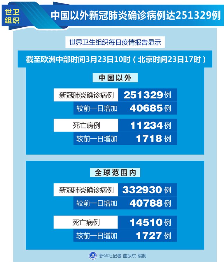 世衛(wèi)組織每日疫情報告顯示,截至歐洲中部時間23日10時(北京時間23日17時),中國以外新冠肺炎確診病例較前一日增加40685例,達到251329例;中國以外死亡病例較前一日增加1718例,達到11234例。