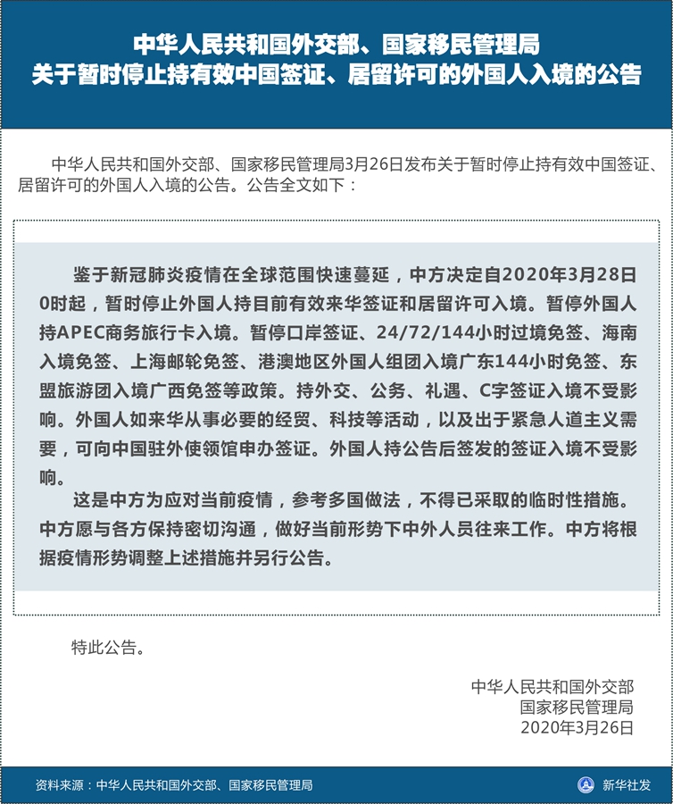 鑒于新冠肺炎疫情在全球范圍快速蔓延,中方?jīng)Q定自2020年3月28日0時(shí)起,暫時(shí)停止外國(guó)人持目前有效來(lái)華簽證和居留許可入境。暫停外國(guó)人持APEC商務(wù)旅行卡入境。暫停口岸簽證、24/72/144小時(shí)過(guò)境免簽、海南入境免簽、上海郵輪免簽、港澳地區(qū)外國(guó)人組團(tuán)入境廣東144小時(shí)免簽、東盟旅游團(tuán)入境廣西免簽等政策。持外交、公務(wù)、禮遇、C字簽證入境不受影響。外國(guó)人如來(lái)華從事必要的經(jīng)貿(mào)、科技等活動(dòng),以及出于緊急人道主義需要,可向中國(guó)駐外使領(lǐng)館申辦簽證。外國(guó)人持公告后簽發(fā)的簽證入境不受影響。