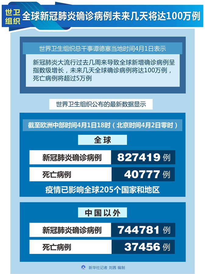 新華社日內(nèi)瓦4月1日電(記者劉曲)世界衛(wèi)生組織總干事譚德塞4月1日表示,新冠肺炎大流行過去幾周來導致全球新增確診病例呈指數(shù)級增長,未來幾天全球確診病例將達100萬例,死亡病例將超過5萬例。