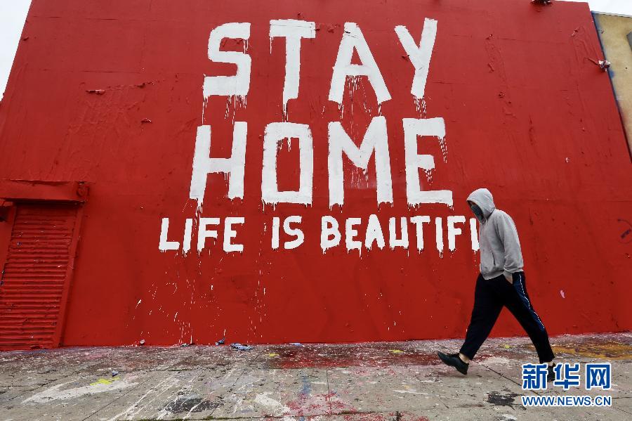 4月9日,一名男子經(jīng)過美國洛杉磯市區(qū)內(nèi)的防疫主題的壁畫。 為減緩新冠病毒的傳播,洛杉磯市長7日下令,民眾在公共營業(yè)場所要戴口罩或用織物遮擋住臉,這一行政令于2020年4月10日生效。 新華社發(fā)