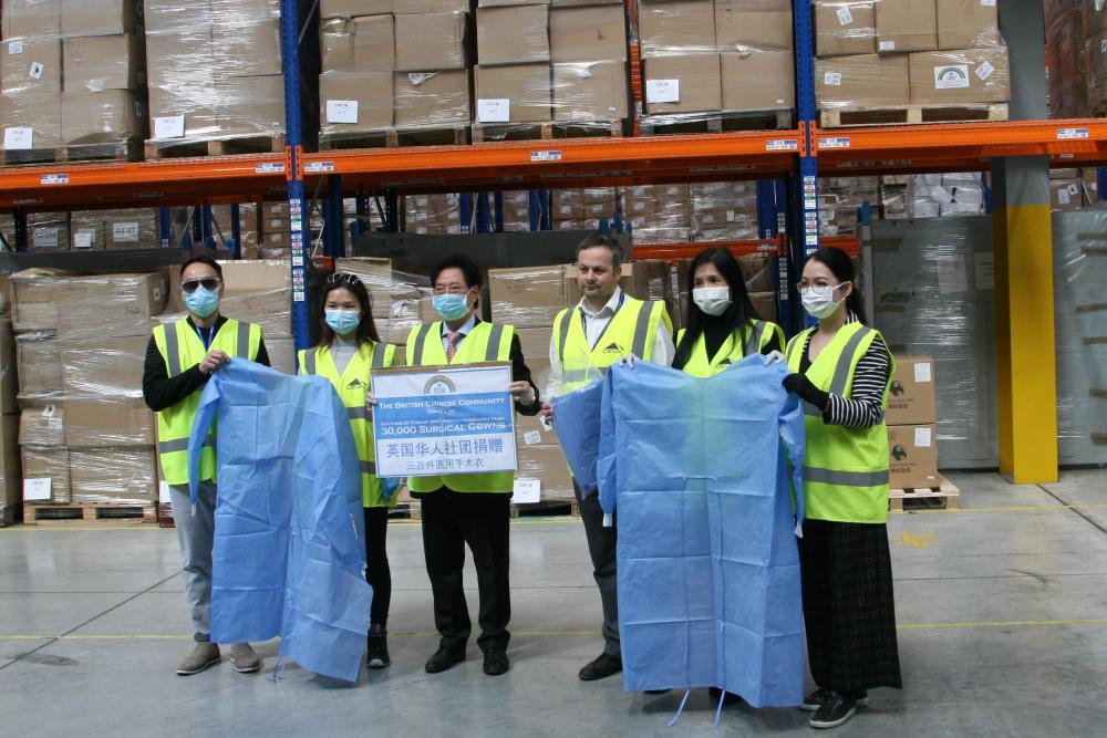 2020年4月20日,英國華僑華人社團(tuán)向英方捐贈(zèng)醫(yī)用防護(hù)服。(新華社發(fā))