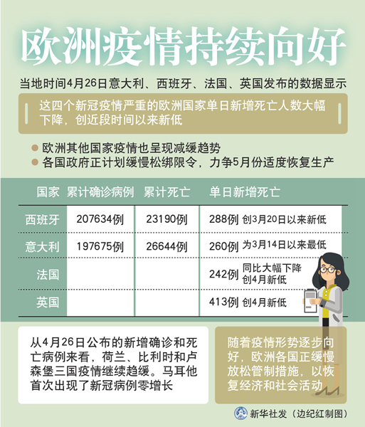 新華社里斯本4月26日電 綜合新華社駐歐洲地區(qū)記者報(bào)道:意大利、西班牙、法國、英國26日發(fā)布的數(shù)據(jù)顯示,這四個(gè)新冠疫情嚴(yán)重的歐洲國家單日新增死亡人數(shù)大幅下降,創(chuàng)近段時(shí)間以來新低。歐洲其他國家疫情也呈現(xiàn)減緩趨勢。各國政府正計(jì)劃緩慢松綁限令,力爭5月份適度恢復(fù)生產(chǎn)。