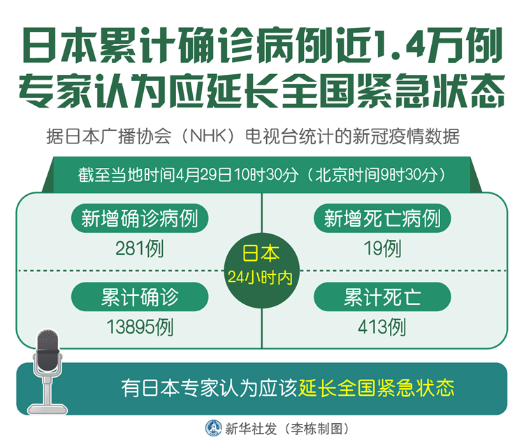 新華社東京4月29日電(記者華義)據(jù)日本廣播協(xié)會(NHK)電視臺統(tǒng)計的新冠疫情數(shù)據(jù),截至29日10時30分(北京時間9時30分),日本24小時內(nèi)新增確診病例281例,累計確診13895例;新增死亡病例19例,累計死亡413例。有日本專家認為應(yīng)該延長全國緊急狀態(tài)。