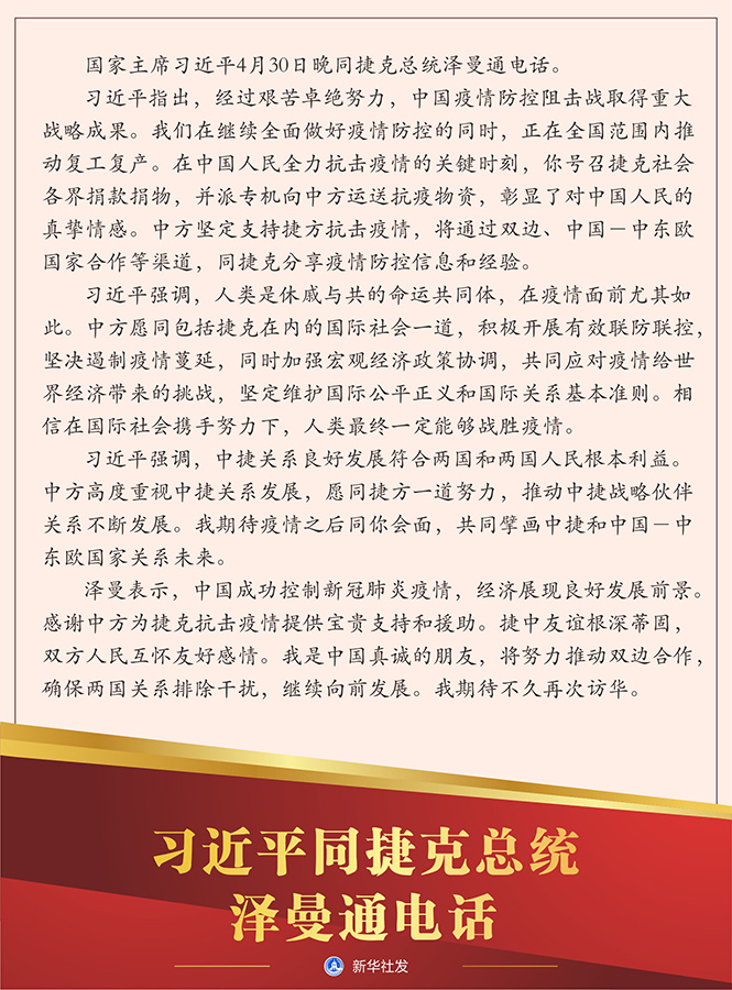 新華社北京4月30日電 國(guó)家主席習(xí)近平4月30日晚同捷克總統(tǒng)澤曼通電話(huà)。