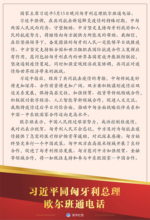 習(xí)近平強(qiáng)調(diào),在共同抗擊新冠肺炎疫情的特殊時(shí)期,中匈兩國人民風(fēng)雨同舟、守望相助。中方堅(jiān)定支持匈牙利政府和人民的抗疫努力,將繼續(xù)向匈方提供力所能及的幫助。我相信,在你堅(jiān)強(qiáng)領(lǐng)導(dǎo)下,奮發(fā)圖強(qiáng)的匈牙利人民一定能夠早日戰(zhàn)勝疫情。中方堅(jiān)定支持聯(lián)合國和世衛(wèi)組織在國際抗疫合作上發(fā)揮應(yīng)有作用,愿同包括匈牙利在內(nèi)的世界各國有效開展聯(lián)防聯(lián)控,堅(jiān)決遏制疫情蔓延,同時(shí)加強(qiáng)宏觀經(jīng)濟(jì)政策協(xié)調(diào),共同應(yīng)對(duì)疫情給世界經(jīng)濟(jì)帶來的挑戰(zhàn)。