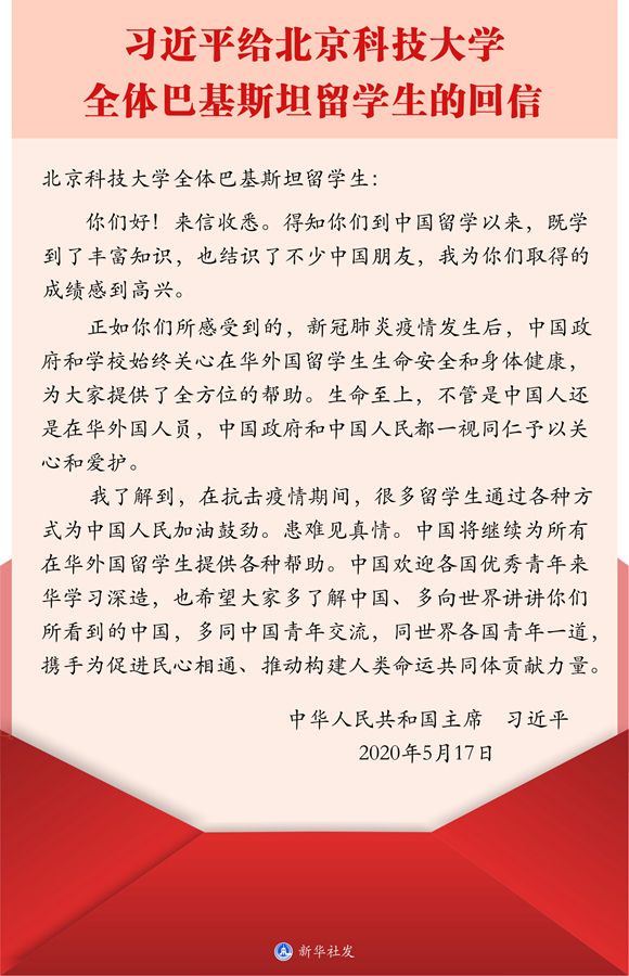 圖表:習近平給北京科技大學全體巴基斯坦留學生的回信 新華社發(fā)