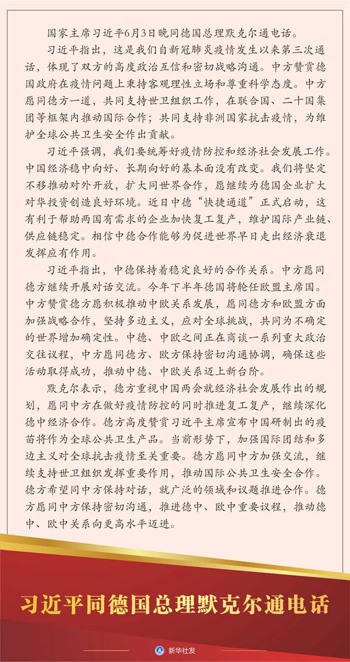 新華社北京6月3日電? 國(guó)家主席習(xí)近平6月3日晚同德國(guó)總理默克爾通電話(huà)。