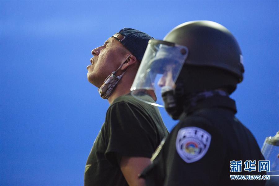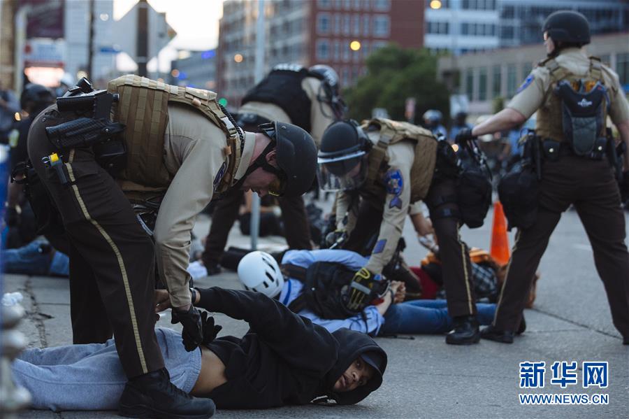 5月31日,在美國明尼蘇達州明尼阿波利斯市,示威者被警察逮捕。 新華社發(fā)(安格斯·亞歷山大攝)
