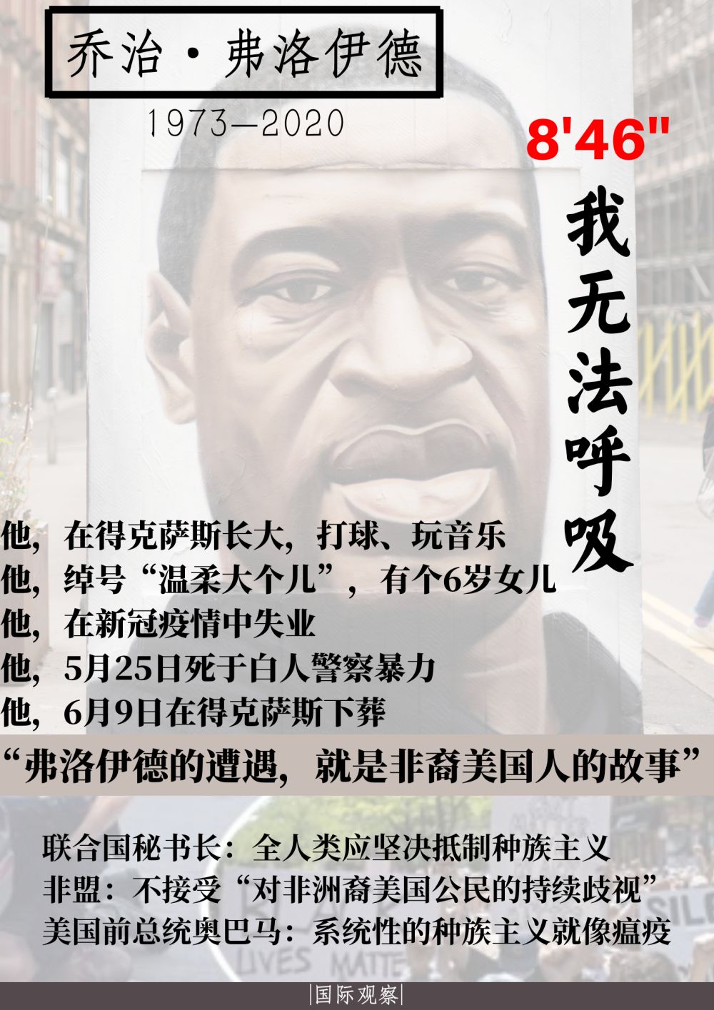 他死前“我無法呼吸”的懇求,在大選年和新冠疫情中,把美國帶入“痛苦時刻”,將長久地載入美國當代史。
