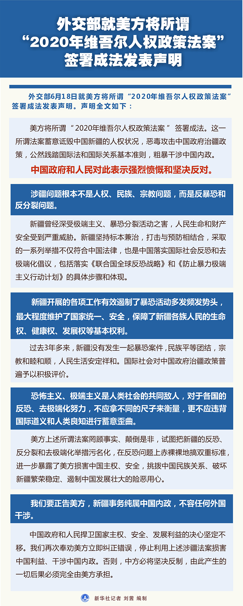 新華社北京6月18日電? 外交部18日就美方將所謂“2020年維吾爾人權政策法案”簽署成法發(fā)表聲明。聲明全文如下: