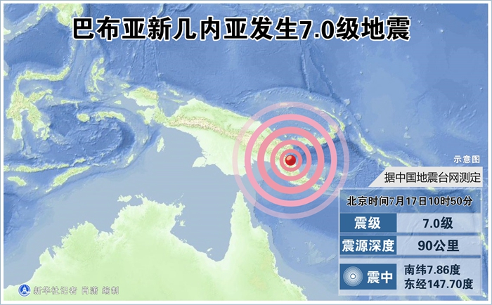 新華社快訊:中國地震臺網正式測定:7月17日10時50分在巴布亞新幾內亞(南緯7.86度,東經147.70度)發(fā)生7.0級地震,震源深度90千米。
