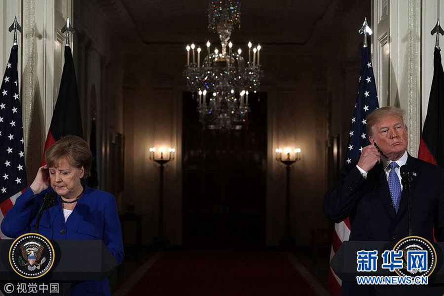 2018年4月27日,美國(guó)華盛頓,美國(guó)總統(tǒng)特朗普會(huì)見(jiàn)德國(guó)總理默克爾。(圖片來(lái)源:視覺(jué)中國(guó))