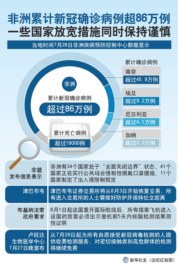 新華社洛美7月28日電 綜合新華社駐非洲地區(qū)記者報道:非洲疾病預(yù)防控制中心28日數(shù)據(jù)顯示,非洲累計新冠確診病例超過86萬例,累計死亡病例超過18000例。在逐步放寬措施的同時,一些非洲國家情況不容樂觀,政府保持謹(jǐn)慎態(tài)度。