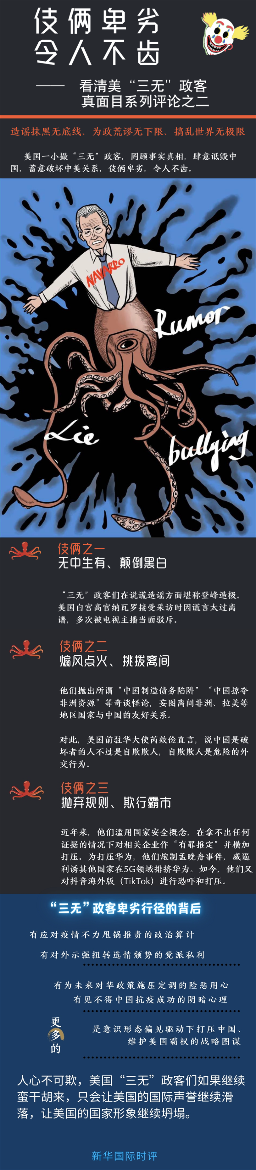 回憶在中央情報(bào)局的任職經(jīng)歷時(shí),美國(guó)國(guó)務(wù)卿蓬佩奧難得說(shuō)了句實(shí)話(huà):“我們?nèi)鲋e、我們欺騙、我們偷竊……這才是美國(guó)不斷探索進(jìn)取的榮耀?!痹谶@種畸形價(jià)值觀(guān)的驅(qū)動(dòng)下,美國(guó)一小撮造謠抹黑無(wú)底線(xiàn)、為政荒謬無(wú)下限、搞亂世界無(wú)極限的“三無(wú)”政客罔顧事實(shí)真相,肆意詆毀中國(guó),蓄意破壞中美關(guān)系,伎倆卑劣,令人不齒。