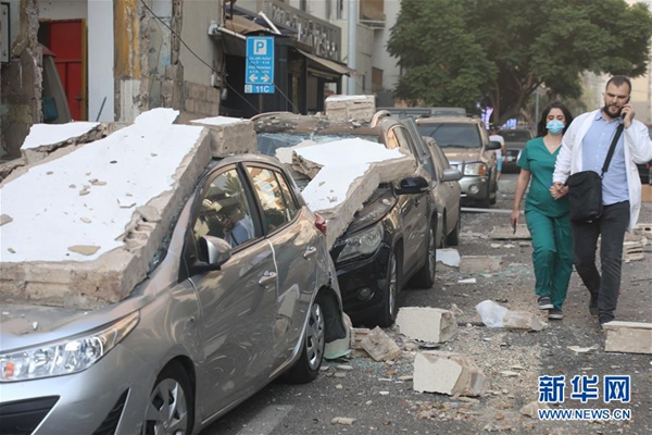 8月4日,在黎巴嫩首都貝魯特,人們從爆炸中受損的車輛旁走過(guò)。 新華社發(fā)(比拉爾·賈維希 攝)