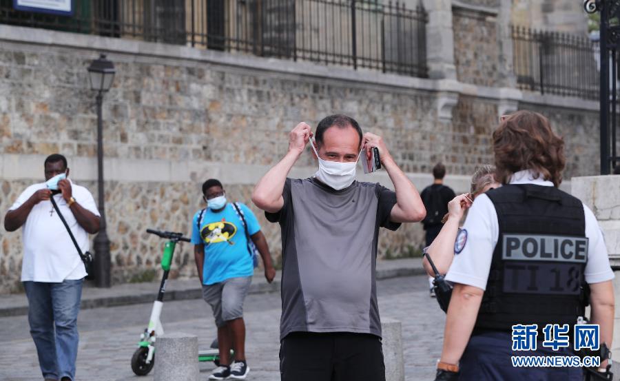 8月10日上午,警察在法國(guó)巴黎蒙馬特高地提醒市民佩戴口罩。新華社記者 高靜 攝