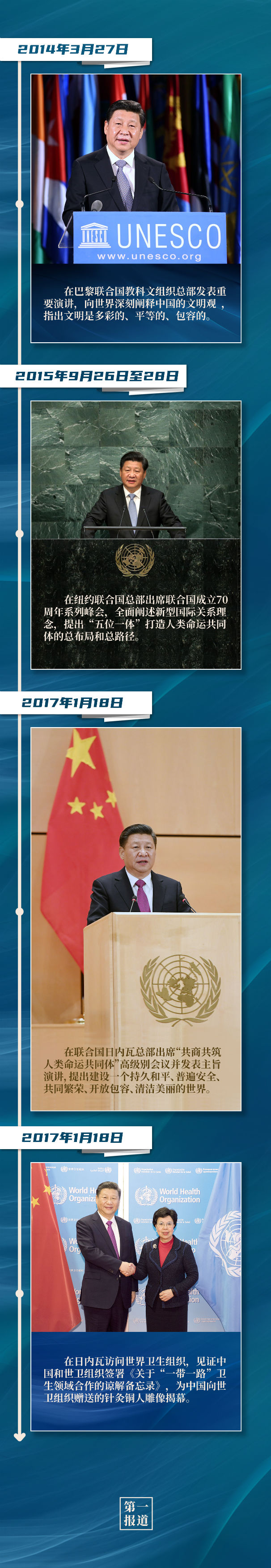 紐約聯(lián)合國(guó)總部、聯(lián)合國(guó)日內(nèi)瓦總部、聯(lián)合國(guó)教科文組織總部、世界衛(wèi)生組織,這些地方都留下了習(xí)主席的訪問(wèn)足跡。站在聯(lián)合國(guó)講臺(tái),習(xí)主席闡述關(guān)于促進(jìn)世界和平發(fā)展的重要主張,表達(dá)對(duì)聯(lián)合國(guó)事業(yè)的堅(jiān)定支持,傳遞攜手各方應(yīng)對(duì)全球挑戰(zhàn)、深化多邊合作的真誠(chéng)意愿。