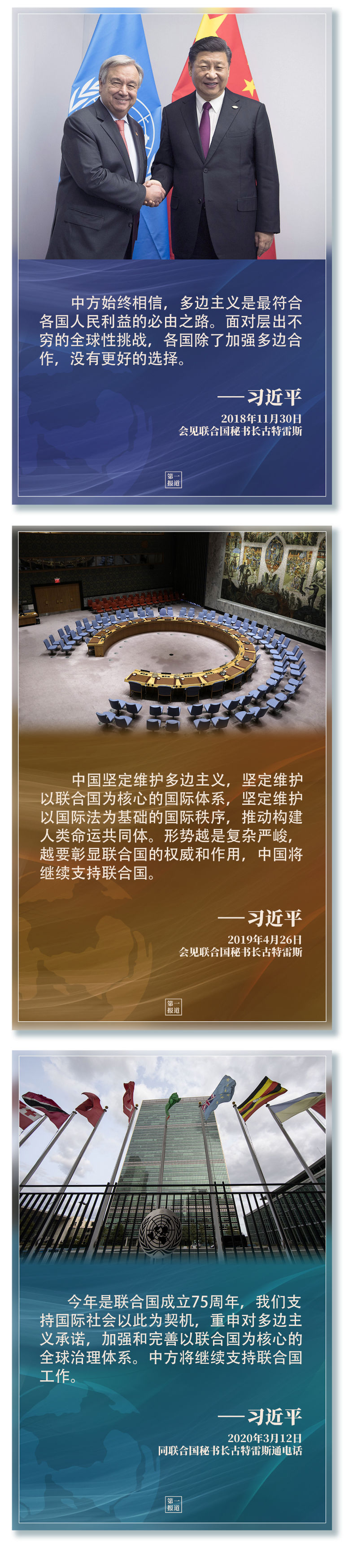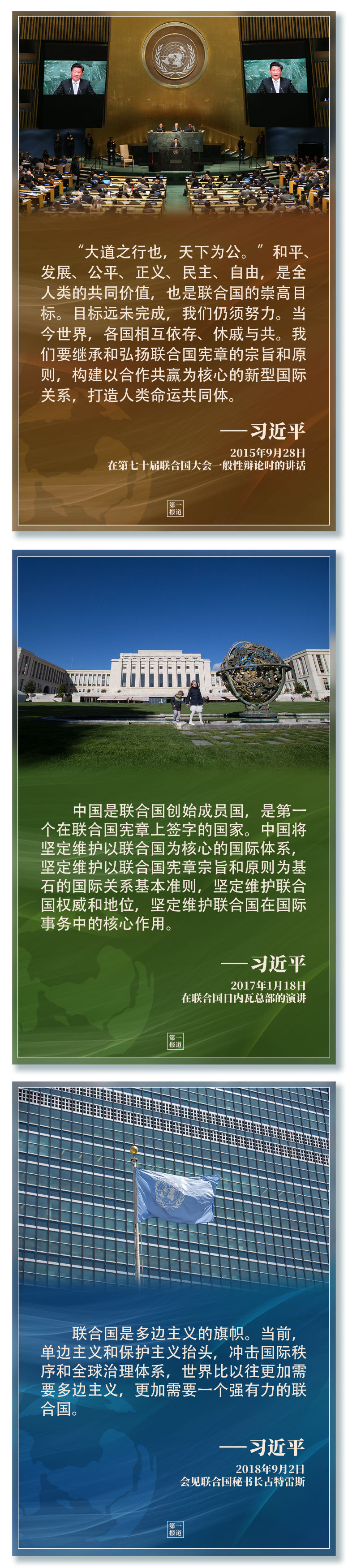 習(xí)主席指出,“支持聯(lián)合國(guó)發(fā)揮作用,維護(hù)聯(lián)合國(guó)權(quán)威和地位,是中國(guó)外交一項(xiàng)基本政策?!?/strong>2013年以來(lái),習(xí)主席多次會(huì)見(jiàn)聯(lián)合國(guó)主要官員,訪問(wèn)聯(lián)合國(guó)總部及聯(lián)合國(guó)專門機(jī)構(gòu),出席一系列聯(lián)合國(guó)活動(dòng)……親自推動(dòng)中國(guó)同聯(lián)合國(guó)的合作,發(fā)出支持聯(lián)合國(guó)事業(yè)、捍衛(wèi)多邊主義的中國(guó)強(qiáng)音。