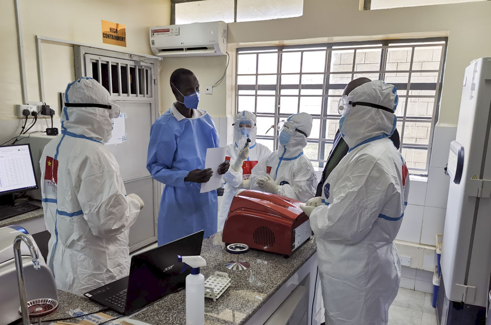 在南蘇丹首都朱巴的一處新冠病毒檢測機構(gòu),中國抗疫醫(yī)療專家組成員與南一線醫(yī)護人員交流(8月21日攝)。 新華社發(fā)(中國駐南蘇丹大使館供圖)