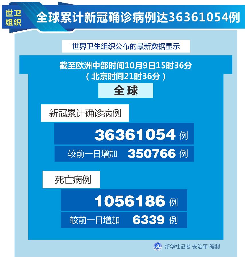 世衛(wèi)組織網站最新數據顯示,截至歐洲中部時間9日15時36分(北京時間21時36分),全球確診病例較前一日增加350766例,達到36361054例;死亡病例增加6339例,達到1056186例。