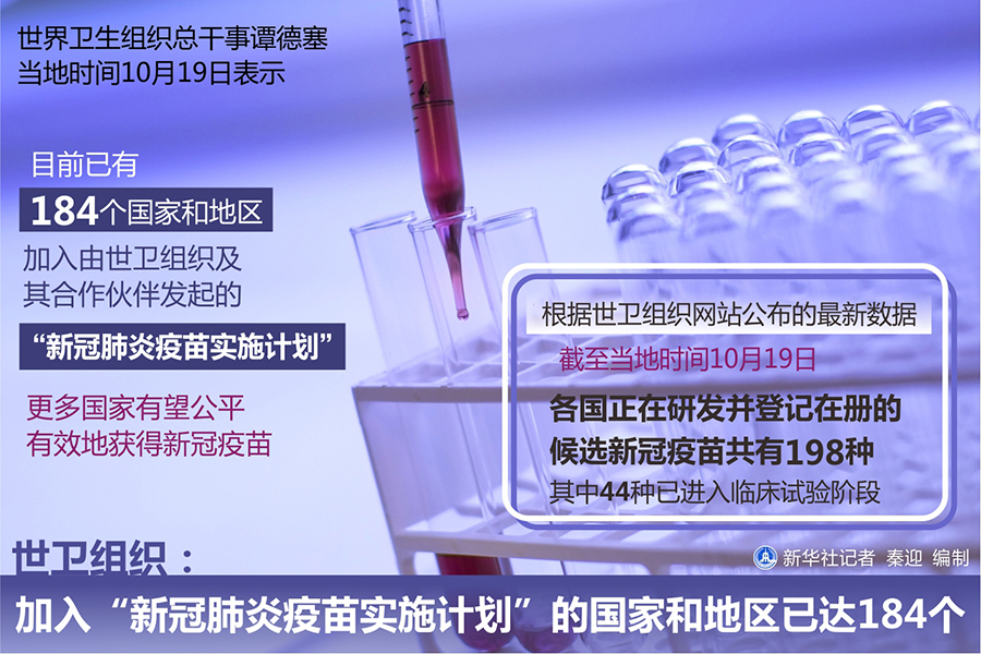 新華社日內(nèi)瓦10月19日電(記者聶曉陽 陳俊俠)世界衛(wèi)生組織總干事譚德塞19日表示,目前已有184個國家和地區(qū)加入由世衛(wèi)組織及其合作伙伴發(fā)起的“新冠肺炎疫苗實(shí)施計(jì)劃”,更多國家有望公平有效地獲得新冠疫苗。
