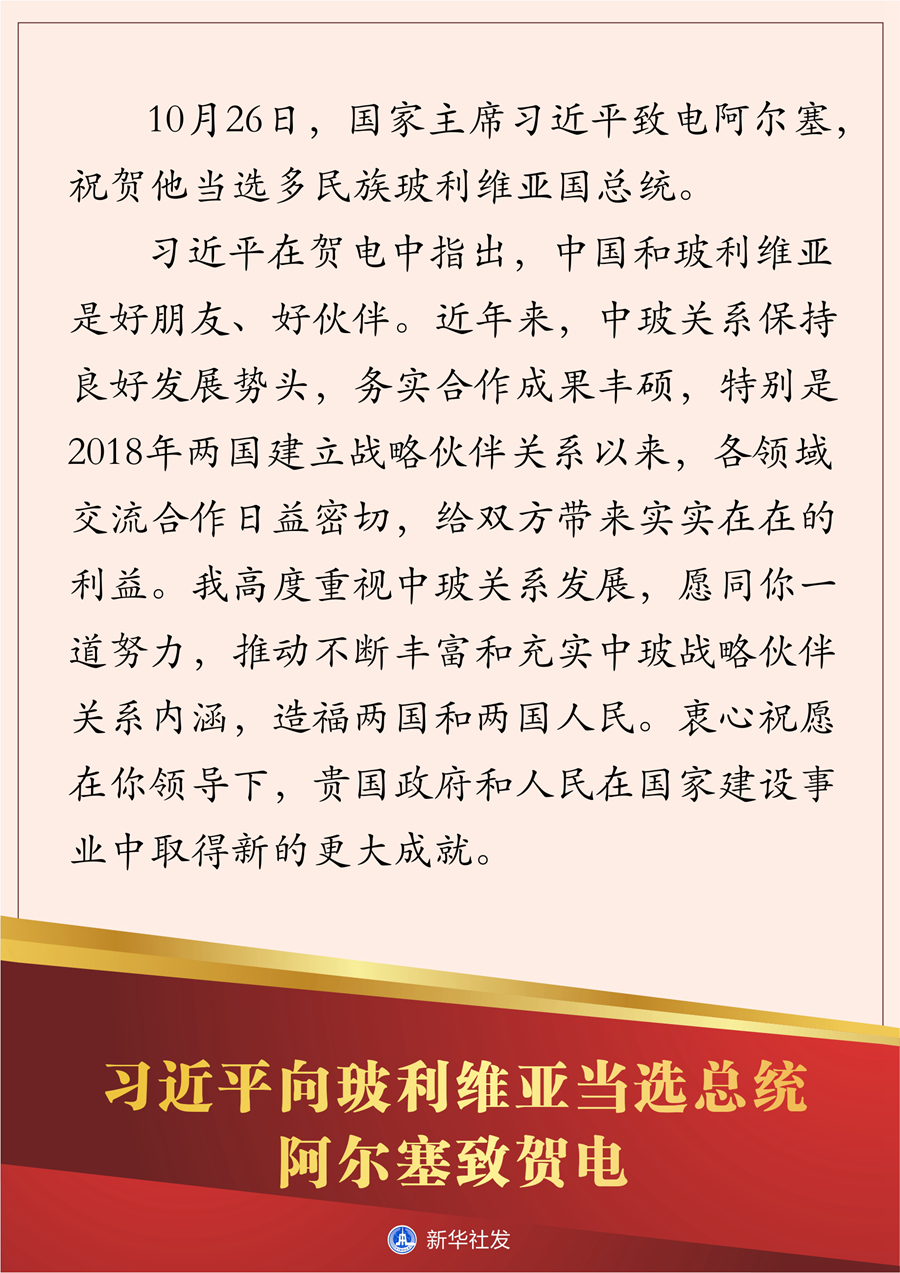 新華社北京10月26日電 10月26日,國(guó)家主席習(xí)近平致電阿爾塞,祝賀他當(dāng)選多民族玻利維亞國(guó)總統(tǒng)。
