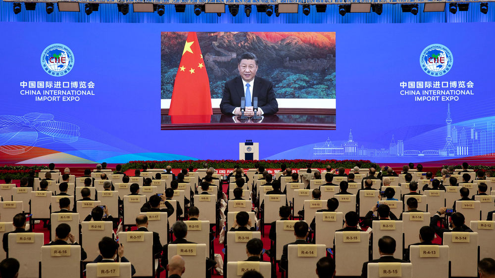 11月4日晚,習近平在第三屆中國國際進口博覽會開幕式上以視頻方式發(fā)表主旨演講。新華社記者 黃敬文 攝