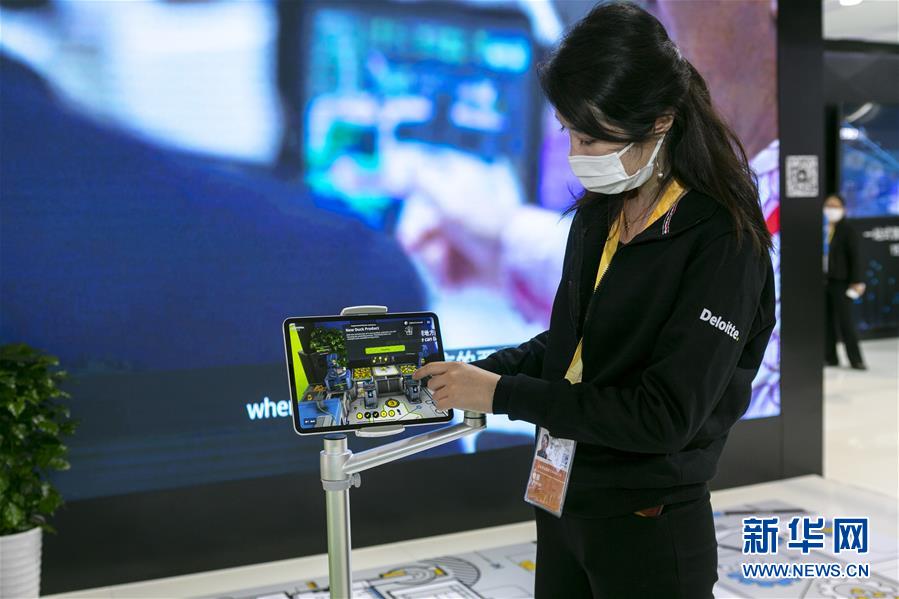 11月5日,在第三屆進博會服務(wù)貿(mào)易展區(qū),德勤公司在中國首發(fā)“德勤小黃鴨智能工廠”,工作人員通過AR(增強現(xiàn)實)技術(shù)展示智能工廠的應(yīng)用場景。 新華社記者 王翔 攝